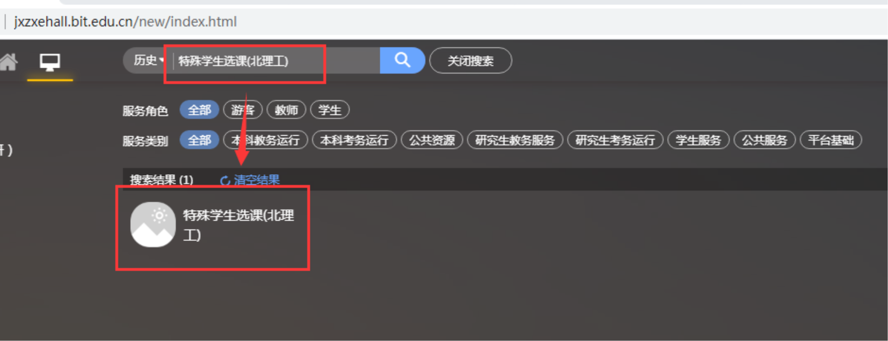 3、搜索应用名称:特殊学生选课(北理工),点击进入。